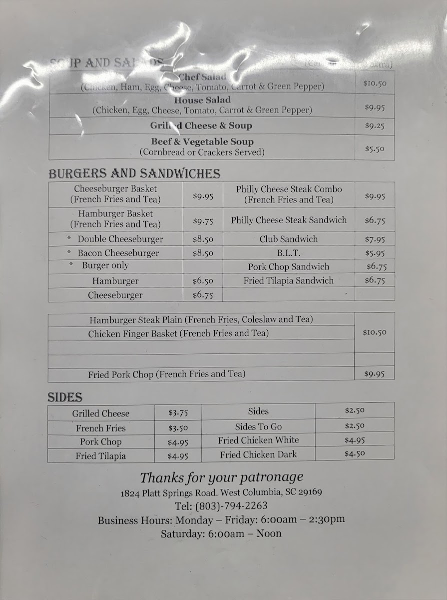 “ YOU HAVE GOT TO EAT & BE SERVED HERE!!! Such a wonderful icon on Platt Springs Road JUST A HAIR AWAY FROM DOWNTOWN TRIANGLE CITY - walkin' or strolling distance even! Okay, breakfast starts very early//they make an immediate switch to lunch at 11 am. Oh yeah, you can get it to go, B.U.T. - if you are dead serious about your true & valid Americana Southern Southeastern experience....you eat here. And have fun, the regulars do. ”